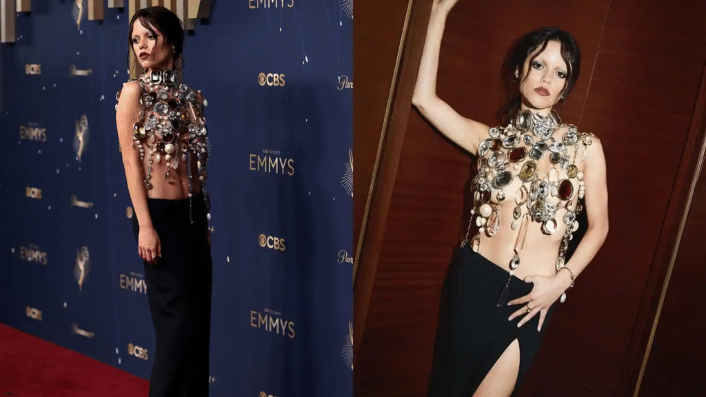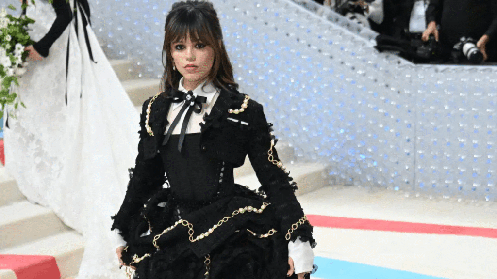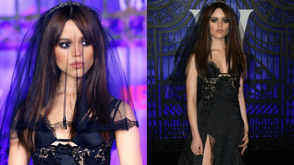 Following the massive cultural impact of her role in Wednesday, Jenna leaned confidently into darker aesthetics. Structured silhouettes, lace detailing, corseted bodices, and sheer overlays became defining elements of her wardrobe.